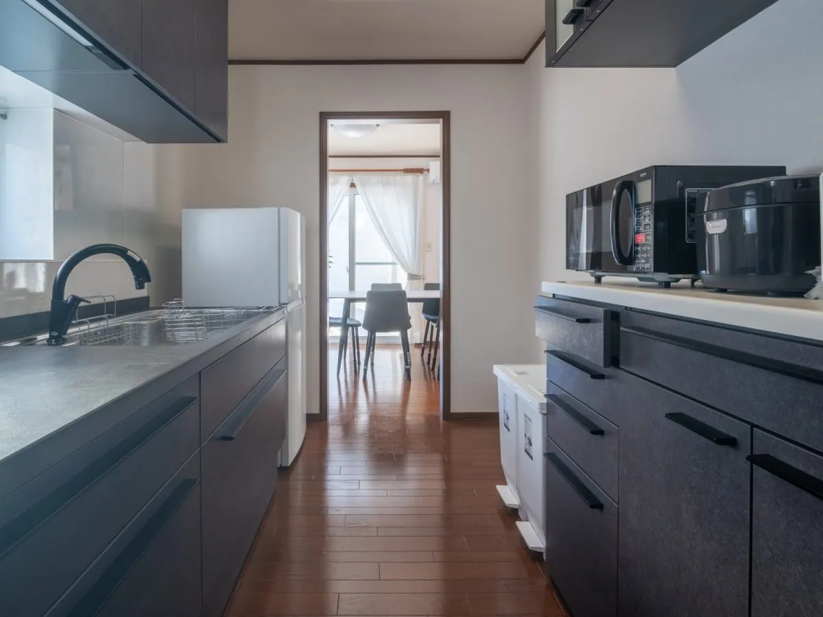 Refrigerator, microwave, cookware (pots and pans), tableware (bowls, chopsticks, plates, cups, etc.), condiments (oil, salt, pepper, soy sauce), oven, electric kettle, baking tray, dining table, and rice cooker.