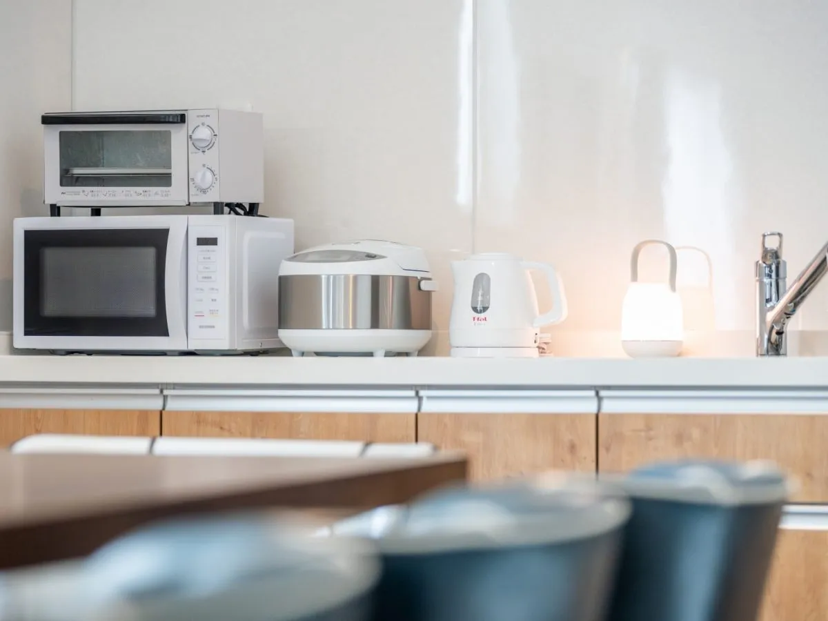 Refrigerator, microwave, cookware (pots and pans), tableware (bowls, chopsticks, plates, cups, etc.), condiments (oil, salt, pepper, soy sauce), dishwasher, oven, electric kettle, baking tray, and dining table.